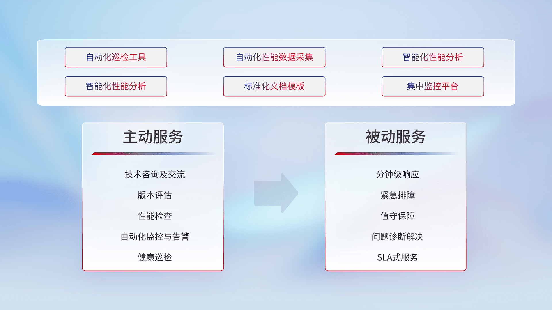 智能化工具和标准化文档,,保障服务质量,,,提供主动服务(包含技术咨询、、、、版本评估、、、性能检查、、、、自动化监控与告警、、、健康巡检)和被动服务包含(分钟级响应、、、紧急排障、、、、值守保障、、、问题诊断解决、、、、SLA服务)。。。